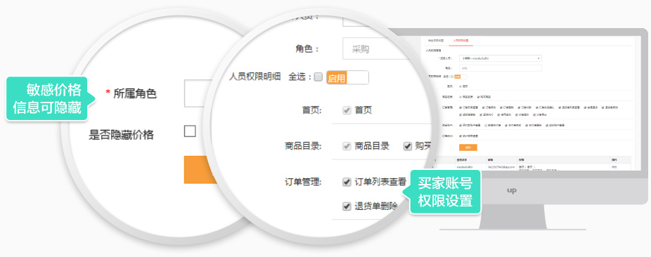 當買家內部訂貨存在分工時,比如銷售人員下單、出納付款等,需要他們使用不同的賬號,操作不同的功能,以免數據錯亂,責任不清;買家進貨價格信息為機密信息,需要特定人員才能知道,以免企業機密信息泄露。